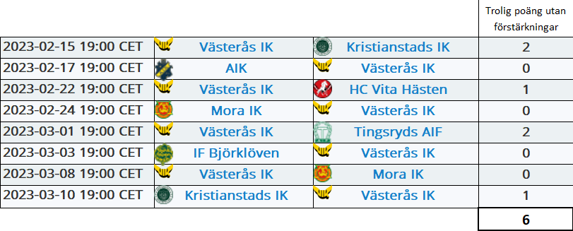 VIK har idag 53 poäng efter 44 matcher. Bara åtta matcher kvar nu. Och utan förstärkningar ser det ut som VIK kanske kommer kunna skrapa ihop runt sex poäng till, vilket sannolikt inte kommer räcka för att undvika negativt kval.