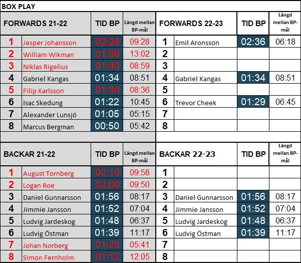 Wikman var seriens bästa BP-forward med hela 13:02 mellan varje mål bakåt i BP. Skottblockskungen Johansson och Rigelius var också väldigt bra. En given ersättare är Emil Aronsson, som i alla fall kommer vinna många fler tekningar än Johansson. Sen är det oklart hur denna trio ska ersättas.