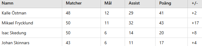Isac Skedung gjorde sina plus som han brukar. Dessutom gjorde både han och Skinnars ganska bra med poäng. Med totalt 35 mål och 86 assist bidrog centrarna med 2,32 mål per match.