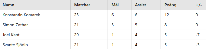 Även Kant kämpar på och försöker hela tiden. Här tror jag dock att NJ kollade lite för mycket på Elite Prospects. Då Kant var utlånad till Västervik förra säsongen gjorde han 5 mål och 3 assist på 11 matcher. I år har han alltså gjort 5 poäng på 29 matcher.