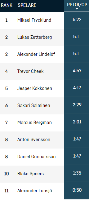 Intressant att alltså Jimmie Jansson verkar ha petats från powerplay (i alla fall mot Djurgården). Frågan hur det tas emot och hur långvarigt det blir. Listan med PP-tid mot DIF, från HockeyAllsvenskan.se):