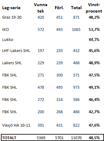 Hur bra tekare är då Hillding? Nedan alla centerns tekningar sedan säsongen 10/11 i Växjö. Obs, siffrorna inkluderar även kval och SM-slutspel: