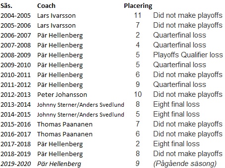 Nedan hur laget presterat i sedan 2004/05 under respektive tränare: