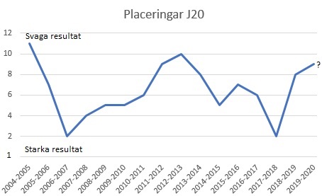 Och utvecklingen tydligare åskådliggjord sedan 2004/05, där man alltså vill komma så lågt i grafen som möjligt. Just nu är VIK inne i en ”tredje våg” av svaga resultat i J20: