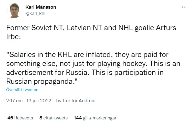 En oerhört märkligt kommentar, i detta fallet råder exakt noll komplexitet. Att ens göra jämförelsen mellan att som spelare skriva på ett kontrakt med en KHL-klubb i dagsläget och att ha signerat kontrakt med NHL-klubbar när USA har befunnit sig i krig visar bara på ett osmakligt försök till relativisering och en kompass som är mer än lovligt trasig.