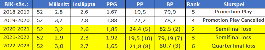 Har hört flera som hyllar Helmerssons förmåga att bygga en stark defensiv, vilket lett till att BIK slutat topp-3 två gånger i BP-ligan som vi kan se ovan. PP dock inget märkvärdigt under Helmersson i BIK.