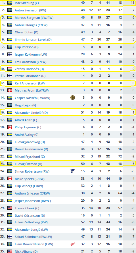 Och Mr. C. är nog väldigt nöjd gällande vilka NJ behållit. Nedan är förra årets lag rankat gällande plus/minus i grundserien: