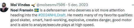 Enligt Expressen är VIK nära ett säsongslång (vilket @CGLager var först att indikera på X redan i mars) av unge backen Noel Fransén som hade en explosionsartad utveckling i J20 för Färjestad 23-24.