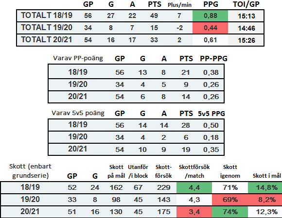 Vad säger då ovanstående? Dels kan vi se att Z fick se sin poängproduktion per match rakt av halverad från 18/19 i kedja med Kalle Östman och ofta Marcus Bergman till säsongen 19/20 då Z återvände från Brynäs, och var väldigt bra inledningsvis innan ett hjärtproblem.