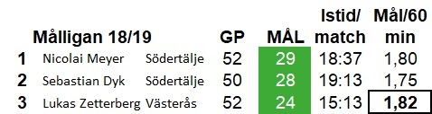 Lukas slutade då alltså trea i skytteligan bakom Södertäljes dominanter Meyer och Dyk. Och sett till enhet istid gjorde faktiskt Z mest mål i ligan den säsongen.