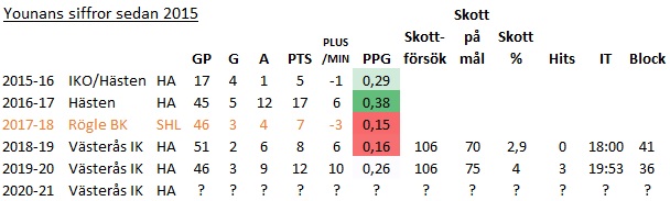 Blir det spel i PP (dock föga troligt om inte skottet förbättras ala Jimmie Jansson) kommer givetvis siffrorna kunna öka än mer. Vi ser också att Younans utveckling varit lite upp och ner då backen hade hela 0,38 poäng/match i Hästen redan 2016/17.