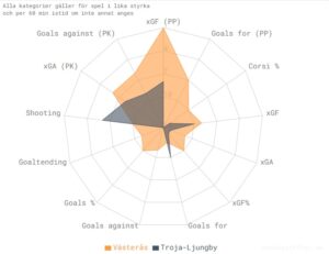 Men enligt detta är VIK bättre i det mesta, förutom att Troja är lite effektivare i skytte i 5-mot-5 och gjorde två mer mål i den spelformen. Troja släppte dock in väldigt mycket mål i 5-mot-5. Ännu mer än VIK faktiskt.