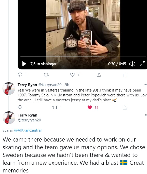 En liten rolig grej på Twitter idag. Såg att namnet Terry Ryan dök upp flödet då han släppt en hockeybok. Jag frågade då VIK-experter på Twitter: ”Visst hade VIK ett utbyte med Montreal Canadiens och lånade in Terry Ryan (numera författare, se nedan) och Brad Brown för träning typ 1995?”